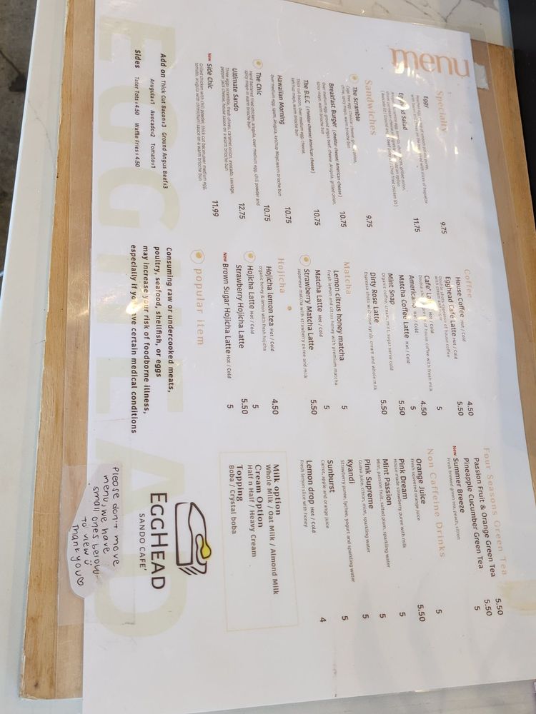 And don't forget to pair your meal with one of Egghead Sando Cafe's specialty teas, such as the Honey Matcha or the Matcha Latte. These beverages are the perfect accompaniment to your sandwich and will elevate your dining experience even further.